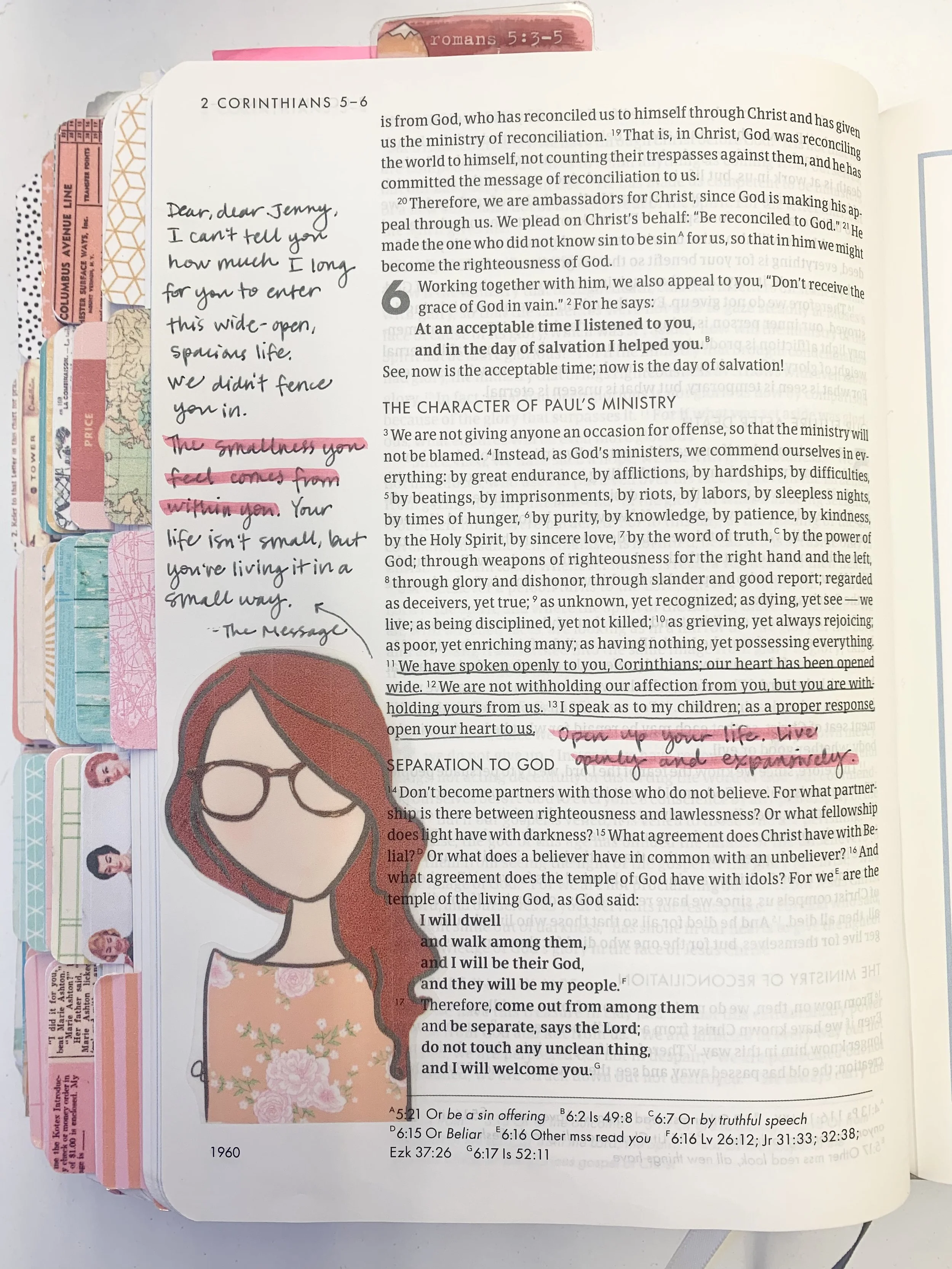 Personalized from The Message and written in the margin in my journaling Bible. (This is the Christian Standard Bible). The girl is a custom illustration from Beth Castro of Beloved Society. I print them on clear sticker paper so the text is still visible.
